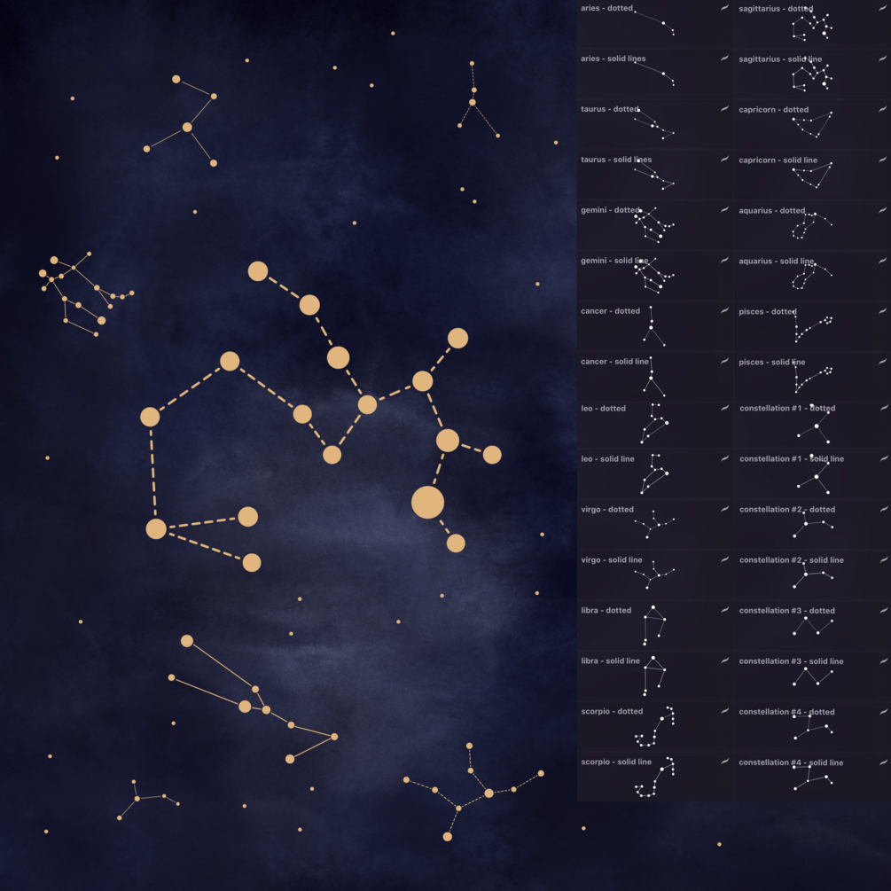 16 different constellation stamp brushes, each in 2 different styles (32 brushes in total)